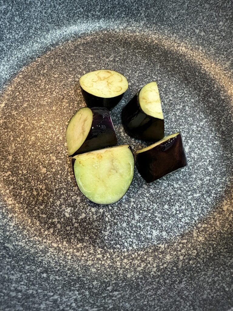 ②フライパンを温め油をひき、中火でナスを炒める。ナスに焼き色が付き、しんなりしてきたら一度フライパンから引き上げます。