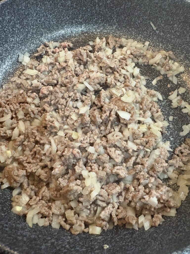 ③同じフライパンににんにく、しょうが、ひき肉を入れて色が変わるまで炒めます。