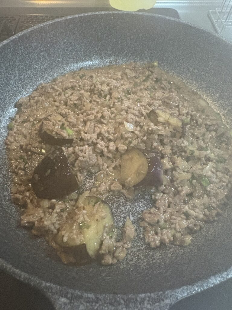 ④玉ねぎを加えて全体が馴染んできたらナスを戻し、味噌、料理酒、みりん、しょうゆ、砂糖を加え、20mlほど水を加えて強火で煮込みます。