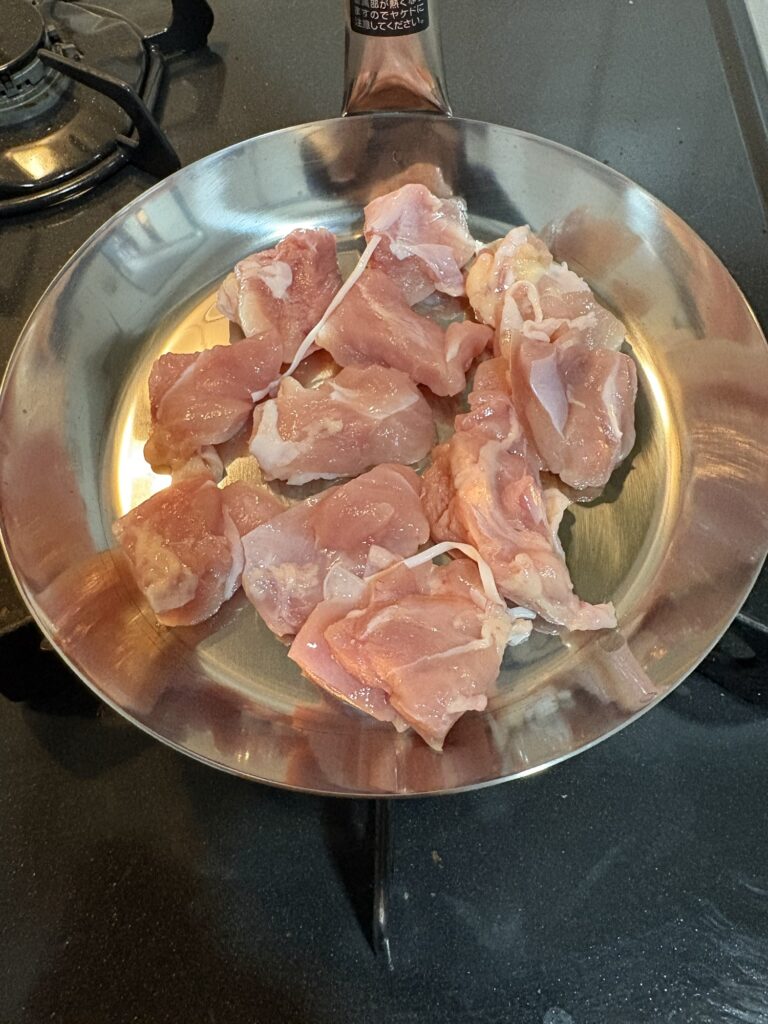 ②鶏肉を親子鍋に皮目を下にして少し焼き色が付く程度に焼きます。