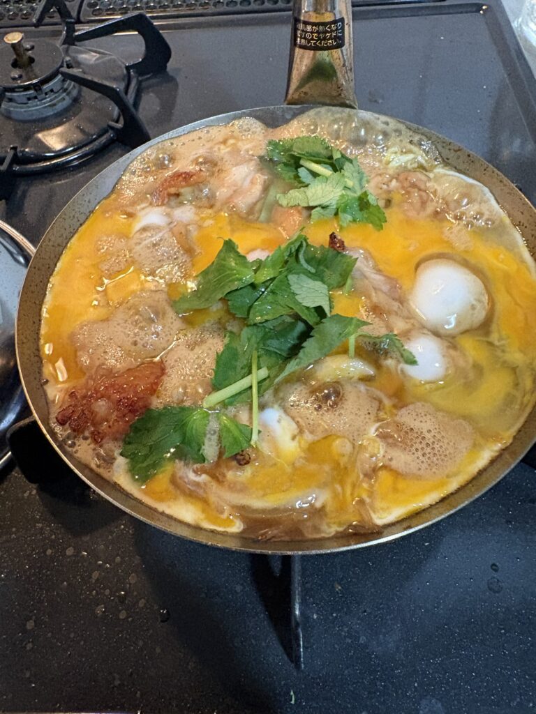 ④軽く溶いた卵を上から掛け、三つ葉を乗せて蓋をして1分半〜2分待ちます。(卵を溶きすぎないのがポイントです)
